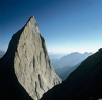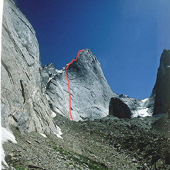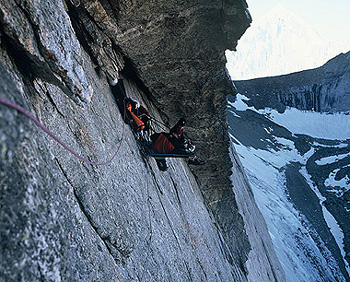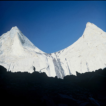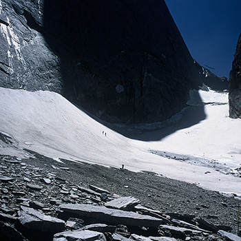 Další den přelézáme boční morénu ledovce nad naším ležením a nakukujeme do úzké dolinky. To co vidíme nás okamžitě dostává do kolen. Nad námi se tyčí tisícimetrová západní stěna piku 4810. Je nám jasné, že jsme našli to, kvůli čemu jsme se sem plahočili dobrých 6000 kilometrů.