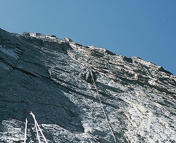 na Žlutou stěnu, naproti přes údolí, prvovýstup Meresjev 9-/9 A3(Kopáček, Zákora).