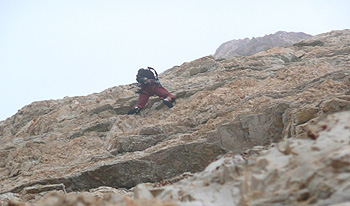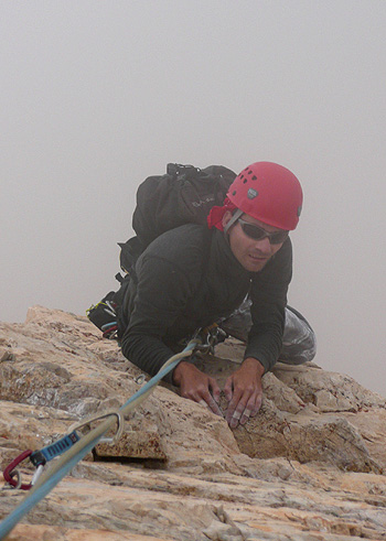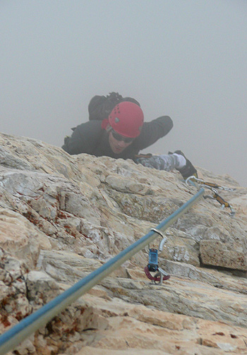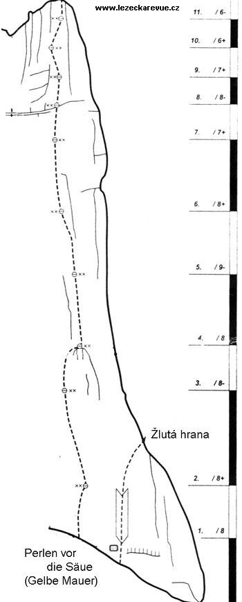 téměř 240 metrů pod vámi. Poslední dvě délky na vrchol jsou už snadné, ale dosti rozbité, což zvyšuje objektivní nebezpečí výstupu. I zde jsou postupové nýty.